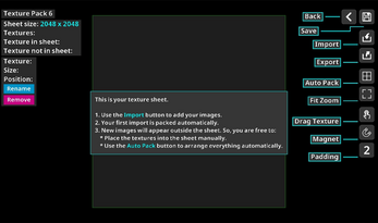 - Manual & Auto Packing: New imports appear outside the sheet. Use the Auto Pack button to arrange all textures instantly, or enable Drag Texture for manual placement.